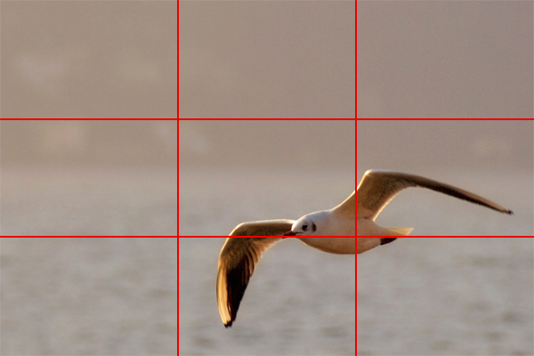 Riproponiamo l'immagine della pagina precedente per capire meglio. Si noti come il gabbiano risulti posizionato lungo le linee (dette anche linee di forza) e in corrispondenza della loro intersezione. Proprio in corrispondenza delle intersezioni è buona cosa posizionare il proprio soggetto, ricordandosi se possibile si far caso allo svolgimento della scena, come può essere in questo caso il verso del volo oppure lo sguardo di una persona, lasciando più "aria" nelle rispettive direzioni e scegliendo quindi la collocazione decentrata a destra o sinistra.