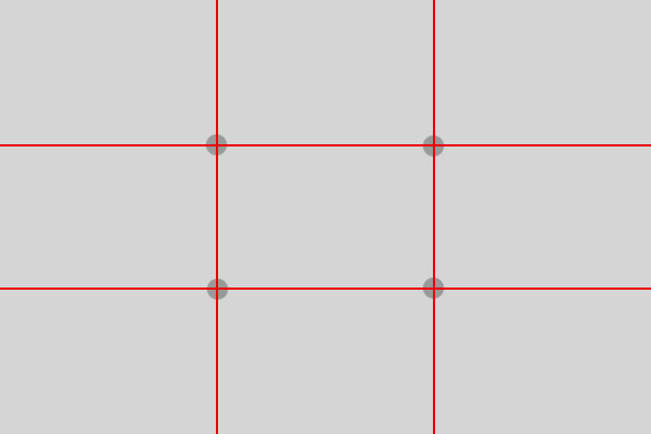 L'incrocio delle linee genera di fatto quattro punti, detti punti di fuoco, focali o di forza. Una buona composizione prevede di posizionare proprio in corrispondenza di questi punti(anche approssimativamente) il proprio soggetto. Anche i paesaggi non sfuggono a questa regola, sebbene spesso non vi sia un soggetto particolare, motivo per cui spesso si tende a far coincidere orizzonte o linee ben definite del paesaggio con una delle linee di forza orizzontali. Nel caso proposto in seconda pagina si noterà invece come l'inserimento di alcuni elementi non sia stato casuale, ma in rispetto delle indicazioni fornite dalla regola dei terzi. La riproponiamo qui per comodità: