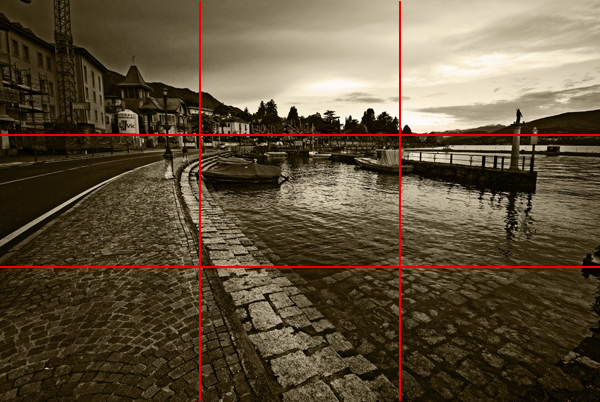 Si noti come la lontana riva sulla sponda opposta del lago sia posta in corrispondenza della linea orizzontale più bassa, mentre la pianta ricada sulla linea di forza verticale sinistra. Un'asimmetria ragionata, potremmo definirla, dettata da una regola che si tende a seguire con una certa frequenza.