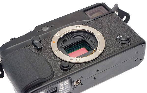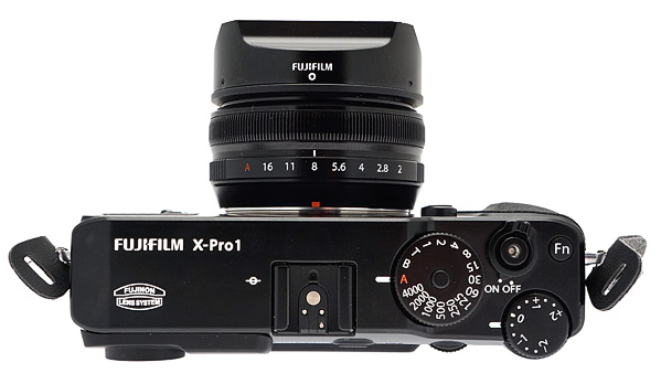 Sulla calotta superiore il pulsante Fn vicino al comando di scatto (quest'ultimo dotato di filettatura per l'utilizzo di controlli remoti) è personalizzabile e può essere assegnato a uno a scelta tra molti comandi, tra cui ISO, RAW o tipo di simulazione pellicola. Con l'introduzione del Quick Menu l'importanza di questo comando è certamente ridimensionata, ma risulta comunque molto comodo in alcuni frangenti. Sul frontale troviamo, naturalmente, il tasto di rilascio dell'obiettivo, ma anche un commutatore per il tipo di messa a fuoco (Singola, Continua o Manuale) e una levetta che sovraintende alla modalità di visualizzazione all'interno del mirino.