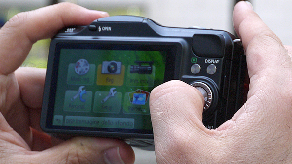 Come sempre il pulsante di avvio della modalità iA è in bella vista e viene retroilluminato di blu quando in funzione. Orientata al pubblico alle prime armi è anche l'interfaccia touchscreen, che permette di selezionare impostazioni, filtri e modalità direttamente con le dita sul display, con l'ausilio di immagini esplicative. L'interfaccia risulta finalmente utilizzabile con le dita anche sul display resistivo, senza richiedere l'intervento del pennino, quasi indispensabile sui modelli precedenti dotati di pari tecnologia.