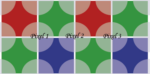 Ogni pixel immagine è il risultato dell’interpolazione di almeno tre fotodiodi, uno per ogni colore primario. Tempo fa Sony ha progettato una variante del filtro di bayer sostituendo ad uno dei filtri verdi il colore Smeraldo Emerald, lo spazio colore che ne deriva passa da RGB ad RGBE.