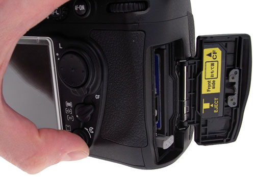 A differenza delle sorelle più piccole, la Nikon D300 si affida alle schede Compact Flash per la memorizzazione delle immagini. Lo slot si torva nell'impugnatura ed è accessibile tramite uno sportello, il cui comandi di apertura a scatto è posto vicino al display, in basso a destra. Sul lato opposto sono presenti diversi connettori, tra cui spicca quello HDMI.