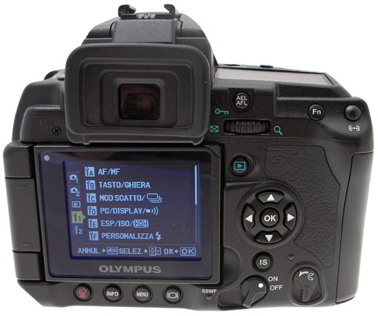 L'altro particolare che differenzia la E-3 dal resto della gamma è la ricchezza di pulsanti sparsi in giro per il corpo. Sul dorso, sotto il display orientabile da 2,5", troviamo i comandi per l'eliminazione delle foto, per l'attivazione delle diverse informazioni sul display, per l'accesso al menu e l'attivazione della modalità Live-View. Poco più a destra è integrato il LED che segnala il funzionamento del sistema Supersonic Wave Filter (SSWF), che grazie allo scuotimento ad alta frequenza del modulo sensore permette il distacco da esso delle particelle di polvere.