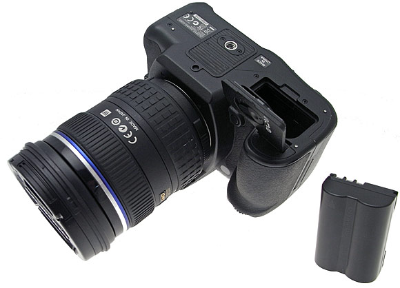 Il lato inferiore ospita la filettatura in metallo per l'aggancio a cavalletti e il vano batteria, apribile tramite l'azione su un commutatore a due vie; questo meccanismo permette di utilizzare una guarnizione contro gli agenti atmosferici e fa parte della tropicalizzazione che caratterizza tutto il corpo. Aperto il vano per estrarre la batteria è necessaria una ulteriore pressione sul dispositivo di ritenzione in plastica di colore rosso. L'accumulatore agli ioni di litio PS-BLM1 da 1500mAh è lo stesso adottato sul resto della gamma reflex Olympus, con un indubbio vantaggio dal punto di vista della compatibilità di batterie e accessori di ricarica in caso di acquisto di diversi corpi Pagina 4 - Olympus E-3: menu e comandi