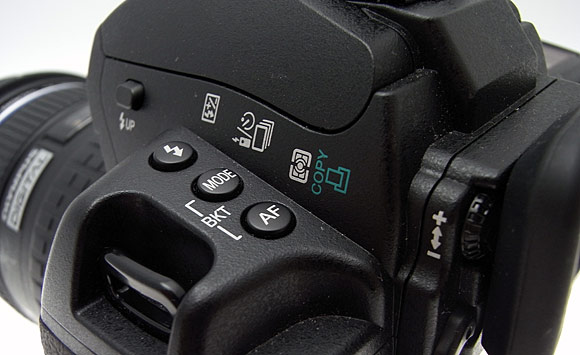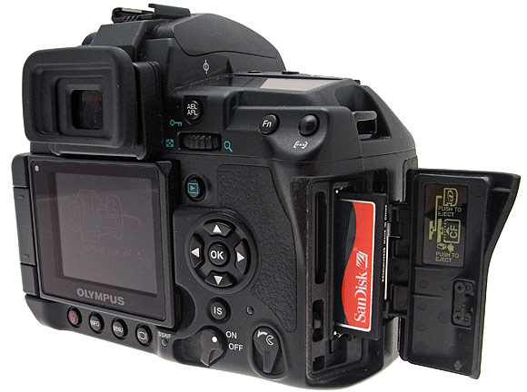 Muovendosi ulteriormente sulla destra e partendo dal basso troviamo il commutatore ON-OFF, posto in una posizione che lo rende facilmente azionabile con il pollice destro; appena più a destra è integrato un comando simile, che permette l'apertura a scatto dell'alloggiamento delle schede di memoria (1 slot Compact Flash e 1 slot xDPicture). L'apertura a scatto premette una certa pressione dello sportello sulla guarnizione, in modo da mettere al riparo da pericolose infiltrazioni d'acqua. Sopra il comando di accensione troviamo il pulsate per la gestione del sistema di stabilizzazione basato su tecnologia sensor-shift, impostabile su spento e acceso in due modalità, di cui una adatta al panning. Più in alto ci sono i comandi direzionali con il tasto "OK"; vicino all'angolo alto a destra del display è invece integrato il pulsante di colore verde per l'attivazione della revisione degli scatti. La fascia superiore del dorso integra la ghiera principale, con appena sopra il tasto di blocco dell'esposizione; più a destra troviamo il tasto "Fn", personalizzabile, e quello che permette di gestire i punti di messa a fuoco. L'oculare è dotato di regolazione diottrica e di meccanismo di chiusura interno, per evitare le infiltrazioni di luce durante le lunghe esposizioni o l'utilizzo della tecnologia Live-View, tutti casi in cui l'occhio del fotografo non si trova a coprire (e oscurare) il mirino.