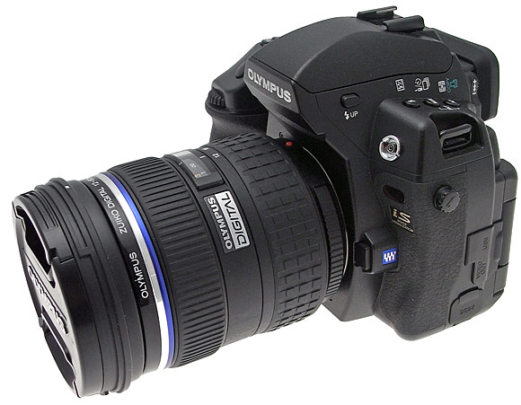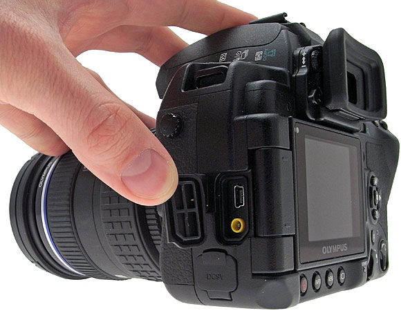 Osservando la E-3 dal lato frontale, sono visibili a destra la presa synchro-flash, chiusa da un piccolo coperchio a vite, il sensore IR per il telecomando e il pulsante di rilascio dell'obiettivo (baionetta QuattroTerzi compatibile con gli altri produttori del consorzio), mentre sulla sinistra, più sotto troviamo invece il tasto per la previsualizzazione della profondità di campo.