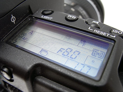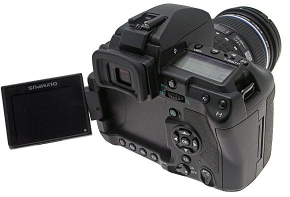 Il lato superiore ospita a sinistra del pentaprisma i comandi di sollevamento a scatto del flash integrato (numero guida 13) e di regolazione della sua intensità e del modo di funzionamento, oltre ai pulsanti per la regolazione dei modi di scatto e delle modalità di funzionamento di autofocus ed esposimetro. La pressione dei pulsanti e la contemporanea rotazione delle ghiere permettono la regolazione dei parametri. Gli ultimi due comandi, se premuti contemporaneamente, permettono la regolazione del bracketing. In posizione arretrata rispetto al pentaprisma la fotocamera integra la slitta per i flash esterni di casa Olympus o compatibili. Sul lato opposto rispetto al pentaprisma troviamo lo schermo LCD monocromatico con retroilluminazione verde (attivabile tramite il pulsante "Light" posto nelle vicinanze) che riporta i principali dati di scatto; tra quest'ultimo e il pulsante di scatto troviamo i tasti per la regolazione del bilanciamento del bianco, della compensazione dell'esposizione e della regolazione della sensibilità ISO. In posizione leggermente più avanzata rispetto al comando si scatto troviamo invece integrata la seconda ghiera.