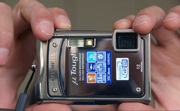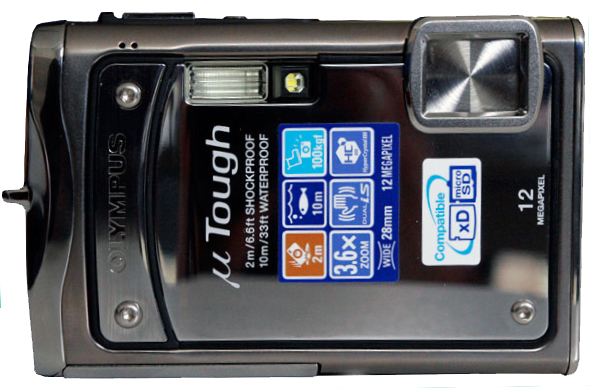 Pagina 2 - Corpo e comandi Olympus mju-tough 8000 restituisce immediatamente un'idea di solidità, lo spessore ed il peso della fotocamera la differenziano dai numeri delle compatte che usualmente testiamo. La struttura metallica del corpo macchina implica una massa di quasi 200 g senza batteria e le dimensioni raggiungono i valori di 95 x 61,7 x 21,4 mm. Il pannello frontale della fotocamera è occupato unicamente dall'obiettivo, coperto da una paratia scorrevole, dal flash e dal led di illuminazione per la ripresa macro. Tre viti a brugola contribuiscono a dare una sensazione di "mezzo da lavoro".