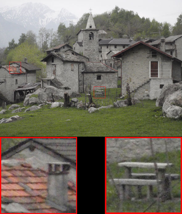 ISO 100 - Modalità Program, riquadro ingrandito al 100% Dal punto di vista della qualità di immagine, Mju Tough 8000 cede alcuni passi rispetto le aspettative. Gli aspetti che ci hanno lasciato perplessi sono essenzialmente tre: il primo che salta all'occhio dopo un analisi al 100% delle immagini prodotte è l'estrema morbidezza di queste ultime. Questo aspetto lo avevamo notato anche in altri modelli di fotocamere compatte Olympus ed è imputabile al software di demosaicing che genera una pasta morbida che spesso confonde i piccoli dettagli. La postproduzione con una maschera di contrasto è consigliata.