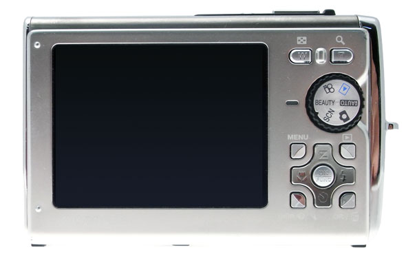 Il dorso è suddiviso in due zone, la prima occupata dal display lcd da 2,7" HyperCrystal, e la seconda posta sulla fascia destra, occupata dai comandi. La tecnologia di produzione del display HyperCrystal restituisce ottimi risultati di visione anche in pieno sole. I comandi si dividono in tre, in alto i tasti di regolazione dello zoom, in mezzo la ghiera di selezione delle modalità di ripresa, in basso una dial disposto a rosa che consente la navigazione all'interno del menu e l'accesso rapido alle modalità di gestione flash, macro e compensazione dell'esposizione.