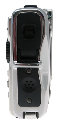 Sul lato sinistro della fotocamera non sono presenti accessi, su quello destro invece si trovano l'altoparlante e la presa multipla che supporta USB, A/V out e alimentazione. La presa è protetta da uno sportello similare a quello utilizzato per il comparto batteria.