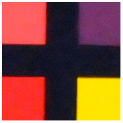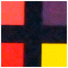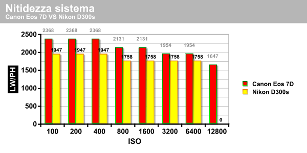 L'algoritmo di riduzione del rumore di Canon per alte sensibilità funziona egregiamente permettendo di recuperare pulizia senza ledere troppo alla definizione dei particolari, aspetto che viene invece enfatizzato dalla D300s. Il livello di rumore rimane comunque più contenuto per la Advanced Mid Range bianco rossa ma le differenze con la D300s sono trascurabili in sede di stampa. Entrambi i modelli propongono tre valori di intensità dell'algoritmo impostabili dall'utente. Il confronto alle mire ottiche non ha senso se effettuato senza tenere presente che le risoluzioni native delle due reflex sono differenti, fornisce però un idea del grado di nitidezza di ogni singolo modello che può risultare utile per avere un quadro di insieme nel confronto tra i due apparecchi.