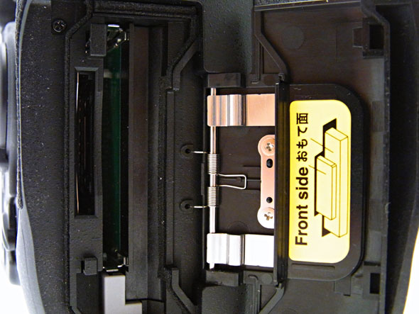 Aprendo il vano schede di memoria ci si rende conto che lo sportello è stato modificato con un sistema più economico rispetto al precedente, ma la presenza di due slot dedicati rispettivamente per schede CF e schede SD/SDHC lascia decisamente soddisfatti.