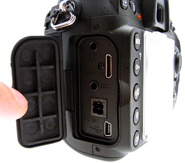 Ciò che lascia trasparire l'integrazione video all'interno della fotocamera viene scoperto sotto la protezione gommata che cela la presa per microfono esterno e la presa HDMI, oltre agli inserti per alimentazione remota, USB 2.0 e jack femmina A/V out. Come nel modello precedente l'impugnatura è estremamente confortevole e le parti gommate offrono un ottimo grip.