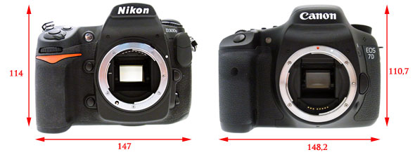 Le due fotocamere mostrano esternamente la stessa dose di muscoli con dimensioni e pesi comparabili, senza batteria e scheda di memoria il peso si attesta poco sopra gli 800 g. Display generosi da 3" ad alta risoluzione e una grande cura per l'ergonomia hanno definito le posizioni di tasti e comandi che consentono di non staccare mai l'occhio dal mirino. Entrambe presentano una doppia ghiera per la gestione dei parametri di apertura e velocità di otturazione, sul vertice dell'impugnatura troviamo quella raggiungibile con l'indice e sul dorso quella raggiungibile con il pollice. Nikon lascia spazio ad un maggior numero di selettori a leva mentre Canon demanda all'uso di tasti ed interfaccia grafica a menu o su display le medesime funzioni. Sia Eos 7D che D300s sono equipaggiate con un joystick che consente la navigazione dei menu e lo scorrimento delle immagini in revisione. A nostro avviso, Canon ha fatto un buon lavoro sul pulsante di attivazione del Live view posto alla destra dell'oculare: grazie al selettore concentrico diventa semplice ed immediato scegliere la ripresa foto oppure video. Al contrario Nikon necessita di entrare nel menu per eseguire tale operazione.