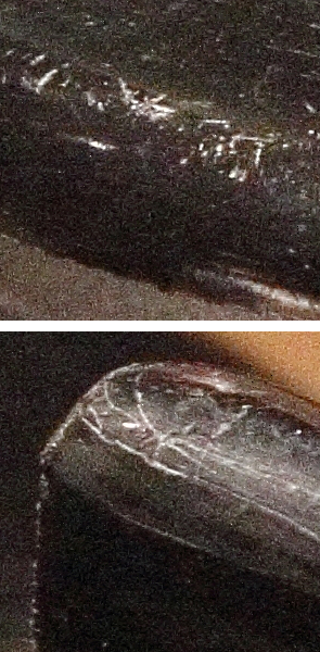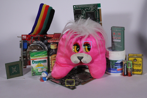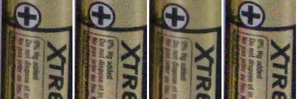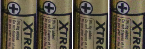 Le considerazioni fatte dall'analisi delle mire ottiche si confermano anche fotografando la nostra scena in laboratorio: in particolare il diverso comportamento dell'algoritmo di riduzione del rumore è identificabile sui piccoli dettagli, come quelli rappresentati dalle scritte sul lato di una delle batterie presenti nella scena, particolari che vedete qui sopra. Pagina 8 - Filtri creativi