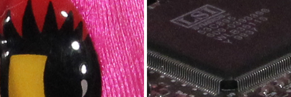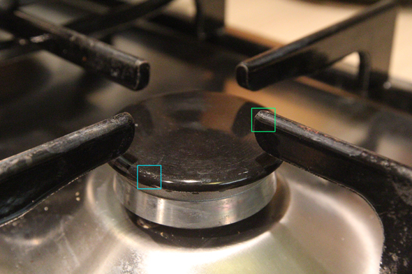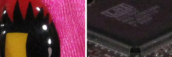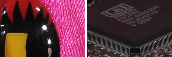 L'ultimo gradino delle sensibilità pienamente utilizzabili è posto da Canon per questa fotocamera a 6400 ISO. I compromessi tra conservazione del dettaglio, grana e rumore cromatico qui cominciano a diventare una sfida difficile, ma 60D dimostra ancora di avere importanti carte da giocare. Per avere un'idea generale (la trattazione dell'intervento del filtro NR ai diversi livelli è demandata alla prossima pagina con gli scatti in laboratorio) vi proponiamo uno scatto a filtro disattivato e lo sviluppo del RAW con DPP secondo il nostro gusto personale, che preferisce avere una grana evidente a fronte della massima conservazione del dettaglio. Il banco di prova è particolarmente complesso, in quanto ad alti valori di ISO la riproduzione dei neri e delle superfici metalliche risulta molto difficile. In particolare ci ha colpito la possibilità di recuperare molti dettagli fini, come i graffi sulla superficie nera dello spargifiamma.