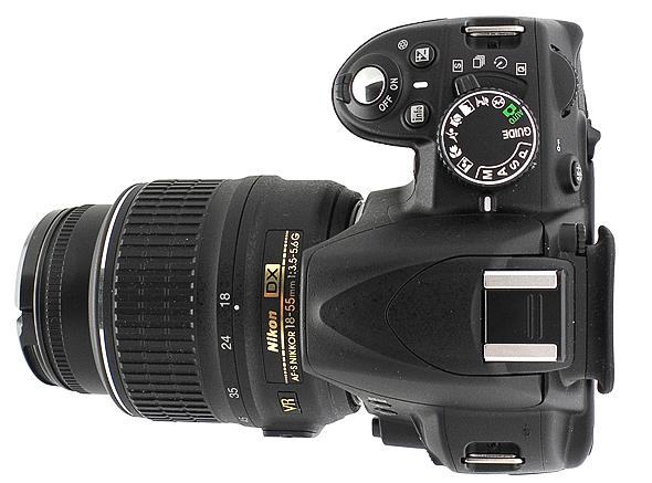 Il corpo è caratterizzato da dimensioni compatte, come d'uso per questa categoria di macchine fotografiche, ma l'ergonomia rimane molto buona, soprattutto in accoppiata all'obiettivo kit AF-S Nikkor 18-55mm 1:3.5-5.6 G VR che con il suo barilotto di dimensioni abbastanza generose e il suo perso ridotto offre un buon bilanciamento del peso e una presa molto salda. L'impugnatura vede l'ormai classico inserto rosso di casa Nikon e rispetto al modello precedente utilizza un vero e proprio inserto gommato al posto di una semplice finitura antiscivolo, offrendo una presa anche in questo caso salda.