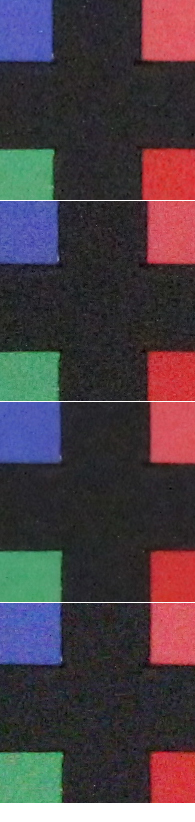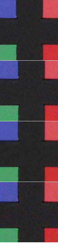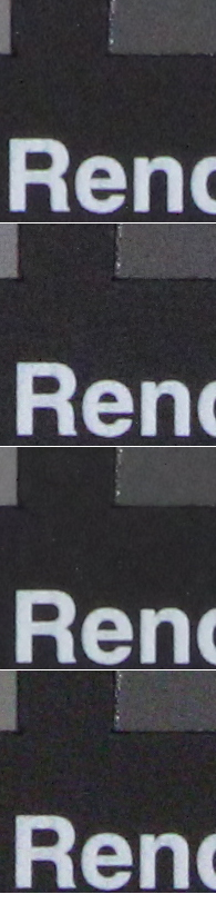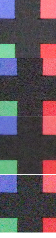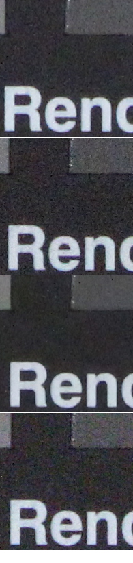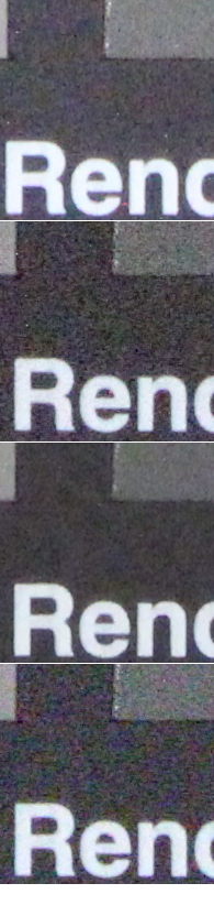 Qui sopra abbiamo messo a confronto Canon EOS 600D con Nikon D3100, entry level di fascia leggermente inferiore (ora in gamma a battagliare direttamente con 600D troviamo Nikon D5100), ma capace anch'essa di arrivare al valore di 12800 ISO. Le immagini che confrontiamo sono quelle con il filtro NR fissato sul valore 'Standard' per Canon EOS 600D e su 'ON' per Nikon D3100. La prima offre quattro livelli di intervento, la seconda permette di scegliere solo se attivare o meno l'opzione. Nikon punta maggiormente sulla nitidezza dei dettagli e dei contorni con una maschera di contrasto più marcata, ma paga dazio con una grana sottile ma evidente e con un effetto un po' 'spalmato' sulle superfici uniformi. Canon sfoca leggermente di più l'immagine, ma mantiene una grana più morbida. Entrambe al massimo della sensibilità pagano dazio con l'apparizione di macchie di falsi colori. Si tratta di due approcci differenti, ma che portano a buoni risultati in entrambi i casi: chi non fosse soddisfatto da nessuno dei due può certamente affidarsi al RAW per risultati più in linea con i propri gusti, potendo contare in entrambi i casi su un ottimo materiale di partenza. Qui sotto invece una porzione dell'immagine ripresa a diversi valori di ISO con il filtro di riduzione del rumore impostato sui 4 livelli possibili. Dall'alto verso il basso nell'ordine in cui sono presentati dal menu delle macchina: Standard, Basso, Elevato, Disattivato.