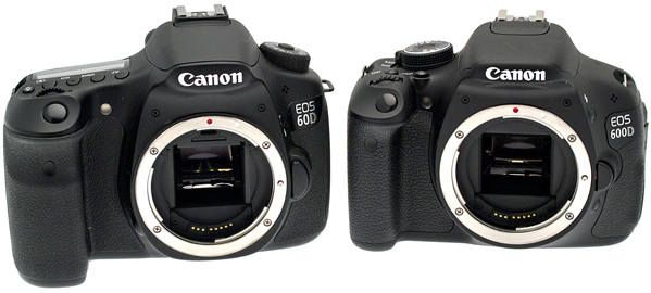 Come evidente dalla scheda tecnica sono molti i punti in comune tra le due reflex Canon: sistema di lettura della luce, modulo autofocus, display orientabile, risoluzione del sensore, slot SD, SDHC, SDXC, processore DIGIC 4, possibilità di gestire flash wireless. Come reso evidente dalle immagini sono molti anche i dettagli che le differenziano: dimensioni, disponibilità di una sola ghiera di regolazione di EOS 600D, mancanza su essa del display sulla spalla. Differente anche il mirino che su EOS 60D integra un pentaprisma, mentre su EOS 600D utilizza un pentaspecchio, con copertura e ingrandimento inferiori. Evidenti anche le differenze nella raffica: 5,3 fps contro 3,7 fps. Continuando il confronto con EOS 60D segnaliamo invece l'otturatore che su EOS 600D si ferma a 1/4000 di secondo.