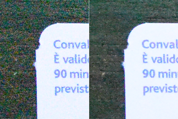 A 3200 ISO con NR moderato la grana è più visibile nelle zone fuori fuoco e comincia ad essereci una lieve perdita di contrasto a livello locale, con una resa dei colori leggermente più slavata e l'apparizione di falsi colori nelle zone più scure. Ottimo l'intervento del filtro NR a livello normale, che mitiga praticamente tutti i diversi difetti.