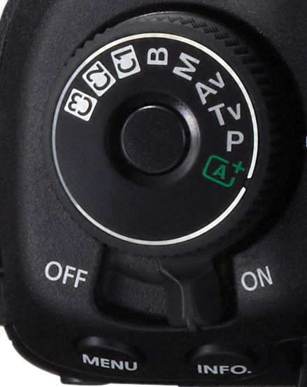 Questa e la regione della ghiera che vede le maggiori differenze tra i diversi modelli e tra un produttore e l'altro. Si va dai prodotti consumer che popolano la ghiera con le più comuni scene preimpostate, ai modelli dedicati ai professionisti che le limitano al massimo o addirittura non le prevedono. Si possono però anceh in questo caso tracciare delle linee generali. La modalità P 'Program' è quella che decide in autonomia la coppia tempo/diaframma in base a un'alchimia di parametri impostati dal produttore. Oltre alla lettura dell'esposimetro vengono tenuti in considerazione aspetti come le caratteristiche dell'obiettivo e la focale in uso, il tutto per permettere al fotografo di pensare solo all'inquadratura e premere il pulsante di scatto. La sensibilità può essere scelta dal fotografo o demandata alla funzione Auto ISO. Diversi produttori permettono al fotografo di agire comunque sulla ghiera di regolazione per avvicinare i parametri di scatto alle sue preferenze, ad esempio aprendo di più il diaframma o accorciando i tempi. Mette lo scatto completamente nelle mani dell'intelligenza della fotocamera la modalità Auto: generalmente è indicata con la scritta per esteso o con un'icona dal colore verde. In questo caso tutto viene deciso dalla macchina fotografica e spesso non è modificabile dall'utente. La macchina cerca di leggere la scena inquadrata e prova ad assimilarla a una delle scene preimpostate di cui è dotata, ottimizzando i parametri di scatto. Con l'aumento della capacità elaborativa dei processori d'immagine delle fotocamere, esse sono in grado di riconoscere ad esempio un panorama, un ritratto, una fotografia macro, una scena notturna e applicare tempo, diaframma, sensibilità, profilo colore, gestione dei toni, più adatti alla situazione. Anche la modalità di messa a fuoco viene adattata alla situazione, attivando ad esempio la messa a fuoco continua con inseguimento per le riprese sportive. Negli ultimi anni alla modalità Auto si sono aggiunte delle versioni ancora più estreme, indicare come Auto+, Auto Premium, iAuto, a seconda del produttore. In questo caso la macchina non solo sceglie la scena, ma può applicare anche modi di scatto particolari, come filtri artistici o di abbellimento della pelle, utilizzo di raffica per creare scatti HDR, utilizzo di scatti a raffica per comporre una sola immagine priva di mosso anche senza alzare troppo la sensibilità o richiedere una mano molto ferma.