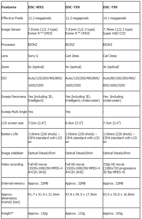 Inoltre Sony da una prova di forza tecnologica abilitando la modalità Sweep Panorama (in questo caso non 3D) sulla piccola Cyber-shot T99, dotata di sensore Super HAD CCD da 14.1 megapixel. Sulle due Cyber-shot TX9 e WX5 la raffica viene utilizzata anche per scattare foto in modalità Sweep Multi-angle, immagini da rivedere sul display della macchina, semplicemente inclinandola, visto che entrambe sono dotate di accelerometri, da diverse angolazioni. La modalità è utilizzabile anche connettendo le due macchine a un televisore del tipo classico 2D.