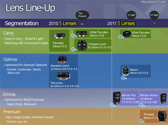 Accanto agli obiettivi pancake 30mm F2 e 20mm F2.8, Samsung dovrebbe introdurre nella prima parte del 2011 un interessante 16mm F2.8 pancake, dotato naturalmente della nuova tecnologia iFunction. Samsung sembra intenzionata a puntare anche su ottiche con destinazioni d'uso particolari (e molto richieste dai fotografi): accanto agli obiettivi zoom tuttofare 18-200mm F3.5-6.3 OIS e 16-80mm 3.5-4.5 OIS, ottimizzati anche per i video, la roadmap del colosso coreano prevede. secondo quanto riporta DCViews, importanti novità.