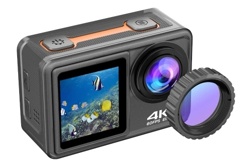 Questa piccola videocamera può essere utilizzata in un numero enorme di situazioni più o meno estreme. Implementa un sensore da 24 MP abbinato a una lente con campo visivo di 170°, all'interno di una scatolina dalle dimensioni di 6,6 x 4,3 x 3,3 cm. I due schermi sono invece da 2 e 1,4 pollici, con l'alimentazione che è curata da una batteria da 1350mAh che può essere ricaricata completamente in 1,5 ore. Per l'archiviazione di video e foto è possibile installare una microSD da massimo 128GB, non fornita nella dotazione originale.