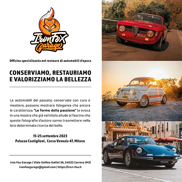 L’interpretazione di queste eleganti “signore” a quattro ruote è stata affidata a due autori che si esprimono in modo diverso guidati dalla stessa passione: Romana Zambon considera le automobili come elementi artistici che decontestualizza per indagare con sapienza sulle loro forme, esaltandone la matericità. Edoardo Baj Macario le riprende in pose classiche dove si alternano visioni d’assieme e indagini sui particolari. La mostra sarà visitabile dal 15 al 25 settembre, con inaugurazione 16 settembre ore 18, a Palazzo Castiglioni - Veranda Liberty, Corso Venezia 47, Milano.