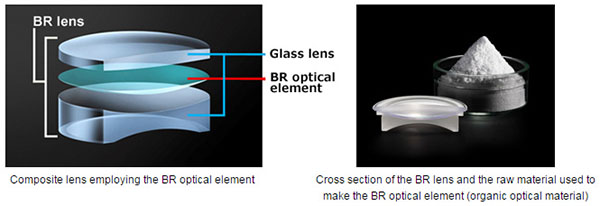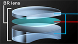 Le proprietà dell'elemento ottico BR derivano dal materiale con cui è costruito che gli dona caratteristiche di dispersione anomale. Canon non scende nei dettagli ma informa solo che si tratta di un elemento di materiale organico incollato tra due vetri di materiale tradizionale, uno concavo e uno convesso.