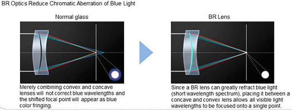 Il lancio del nuovo grandangolo luminoso Canon EF 35mm f/1.4L II USM ha portato al debutto una nuova interessante tecnologia uscita dai laboratori del colosso nipponico, denominata blue spectrum refractive optics (BR Optics). Nata per contenere al massimo l'aberrazione cromatica assiale è in grado di 'piegare' la luce blu in misura maggiore rispetto alle lenti UD, Super UD e alla fluorite. In questo modo l'errore di messa a fuoco della banda del blu (quella con lunghezza d'onda più corta) viene portato quasi a zero, eliminando praticamente del tutto il blue fringing.