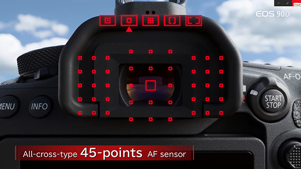Canon EOS 90D aggiunge alla messa a fuoco in Live View Dual Pixel AF un modulo da 45 punti AF di tipo a croce per l'utilizzo a specchio abbassato. A specchio abbassato la macchina utilizza un modulo di lettura esposimetrica RGB+IR da 220K punti, che permette anche di utilizzare la funzione iTR AF con Face Detection. Il mirino ottico ha una copertura del 100% del campo inquadrato. Rispetto alla sorella mirrorless aggiunge anche un joystick sul retro per lo spostamento del punto di messa a fuoco.