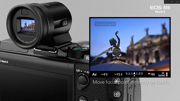 Canon EOS M6 MKII dovrebbe offrire anche un mirino staccabile con pannello OLED e mettere a disposizione lo spostamento del punto di fuoco con la funzione Touch & Drag AF quando il mirino è in uso.