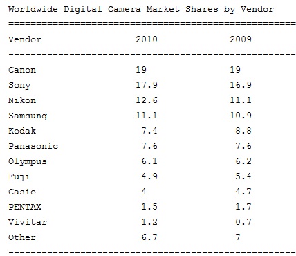 Secondo i dati IDC riportati da Bloomberg, nel 2010 sono stati ben 141 i milioni di fotocamere immessi sul mercato, con una crescita di circa il 10% rispetto all'anno precedente. Hanno contribuito alla crescita del mercato i paesi emergenti, in particolare l'introduzione di nuovi modelli in un mercato cosė ampio come quello cinese. Canon mantiene salda la sua posizione di leader con il 19% di share, quota invariata rispetto all'anno precedente, mentre le posizioni retrostanti vedono una tendenza chiara: la polarizzazione del mercato sui marchi pių grossi, con i vendor minori in calo nelle vendite.