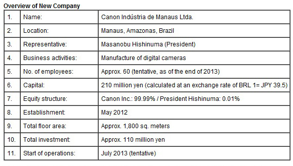 La scelta di Canon è non solo produttiva, ma anche strategica dal punto di vista del marketing e lancia la casa biancorossa alla conquista del Sud America. L'apertura della fabbrica di Manaus, nello stato Amazonas in Brasile è il primo passo di Canon. La prima pietra è stata poggiata nel mese di maggio e gli impianti dovrebbero risultare operativi a partire dal luglio 2013.