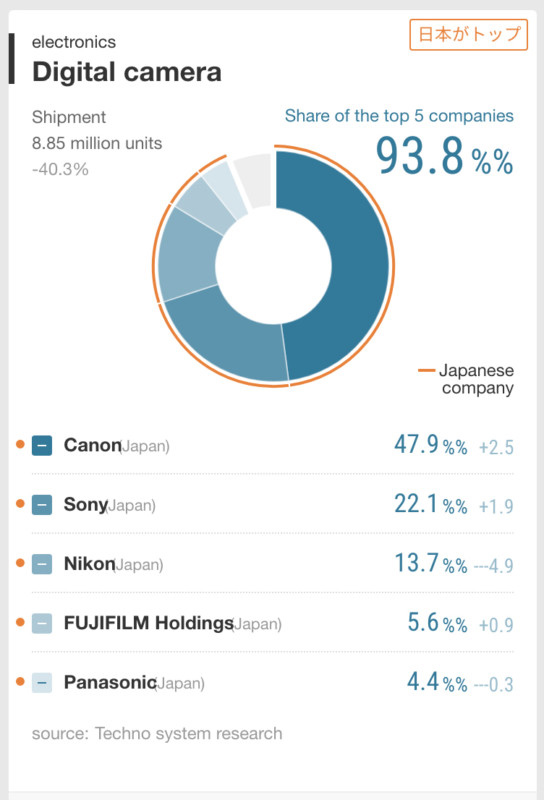 L'analisi portata avanti da Techno System Research parla di un mercato del tutto in mano a a primi 5 brand del settore: Canon, Sony, Nikon, Fujifilm e Panasonic, che nel complesso cubano il 93,8% delle vendite. La polarizzazione è tale che i primi due marchi della classifica, Canon e Sony, da soli rappresentano il 70% del mercato.
