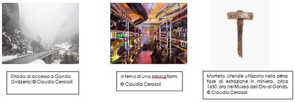 Con L’oro di Gondo, Claudio Cerasoli, fotografo abruzzese, porta al festival la storia del paesino alpino di cercatori d’oro di Cantonese Vallese (meta dal XVII secolo). Il piccolo borgo, dopo un lungo periodo di oblio, è tornato alla cronaca per una nuova forma di preziosi, oggi infatti è noto per le valute digitali, con centinaia di server installati. Dal 2017 infatti, nuovi cercatori d’oro, due giovani esperti di informatica e finanza, “estraggono” criptovalute (come i bit coin) nelle miniere di Gondo, un tempo aurifere.