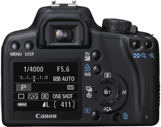 Il sensore utilizzato, sempre di tipo CMOS 22.2 x 14.8 mm, vanta una risoluzione di 10,1 Megapixel, a fronte di quello da 12,1Mpixel della sorella maggiore EOS 450D. Scendono anche i punti di fuoco, sebbene in maniera non sensibile: si passa infatti da 9 a 7, mentre viene confermata l'adozione del processore DIGIC III. La cadenza di scatto continua è di 3 frame al secondo, mentre sul fronte del display troviamo ora un 2,5 pollici da 230.000 pixel con funzionalità Live View (3 pollici sulla EOS 450D). Confermata anche la presenza di una singola ghiera di controllo.