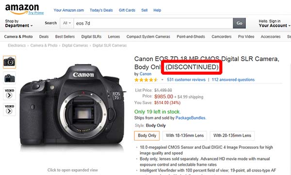 La Canon EOS 7D Mark II (ammesso sia questo il suo vero nome) è una delle fotocamere su cui si è speculato di più in assoluto, grazie alla lunga vita e al successo dell'attuale, prima versione. Da mesi, ormai, il lancio del nuovo modello è dato come imminente, ma dal catalogo Amazon potrebbe essere arrivata la conferma definitiva: la EOS 7D, proposta con il 35% di sconto a meno di 1000 dollari, è etichettata ufficialmente come "discontinued" - fuori produzione.