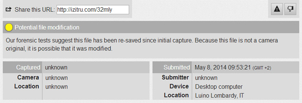 Itzitru informa l'utente in merito alla possibilità che il file in esame sia potenzialmente stato modificato e offre un minimo livello di informazioni in merito al tipo di editing apportato. Purtroppo la versione di test effettuata online si limita a questo e solo ulteriori analisi condotte dagli esperti di Itzitru possono fornire ulteriori dettagli.