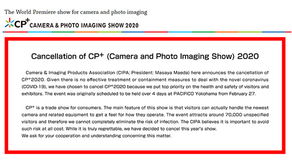 La nota della CIPA giustifica la scelta dell'annullamento per la mancanza a oggi di efficaci trattamenti contro il virus e di altrettanto efficaci misure di contenimento. L'evento, di stampo consumer, richiama a Yokohama un flusso di visitatori che era stimato per questa edizione in 70.000 persone da 120 paesi. Per evitare del tutto il rischio di contagio la scelta è quindi di eliminare del tutto dal calendario la fiera.