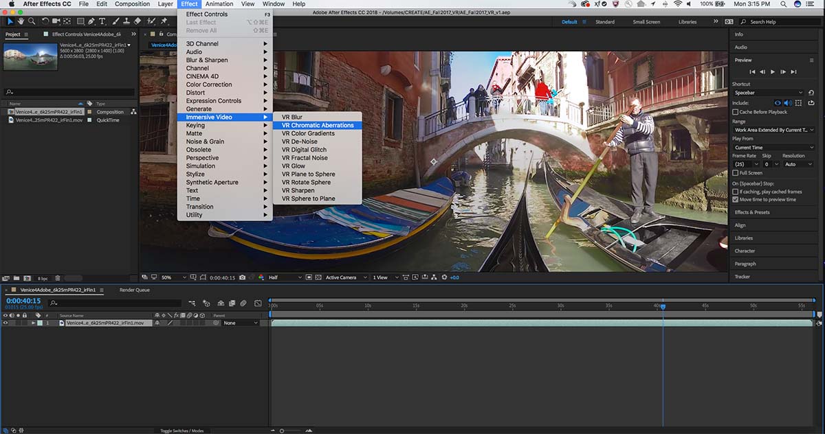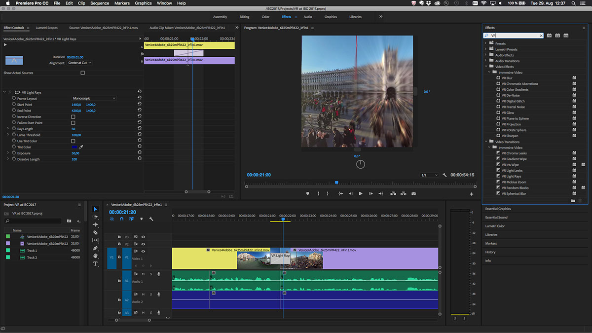 Le novità che maggiormente cattureranno l'attenzione, e che coinvolgono sia Premiere sia After Effects, sono però quelle legate ai contenuti immersivi, che si concretizzano nel VR video mode di Premiere e nel nuovo VR Comp Editor di After Effects. Nuovi effetti VR (Blur, Glow, Sharpen, De-noise e Chromatic aberration) e transizioni VR estendono le possibilità di editing dei video immersivi.
