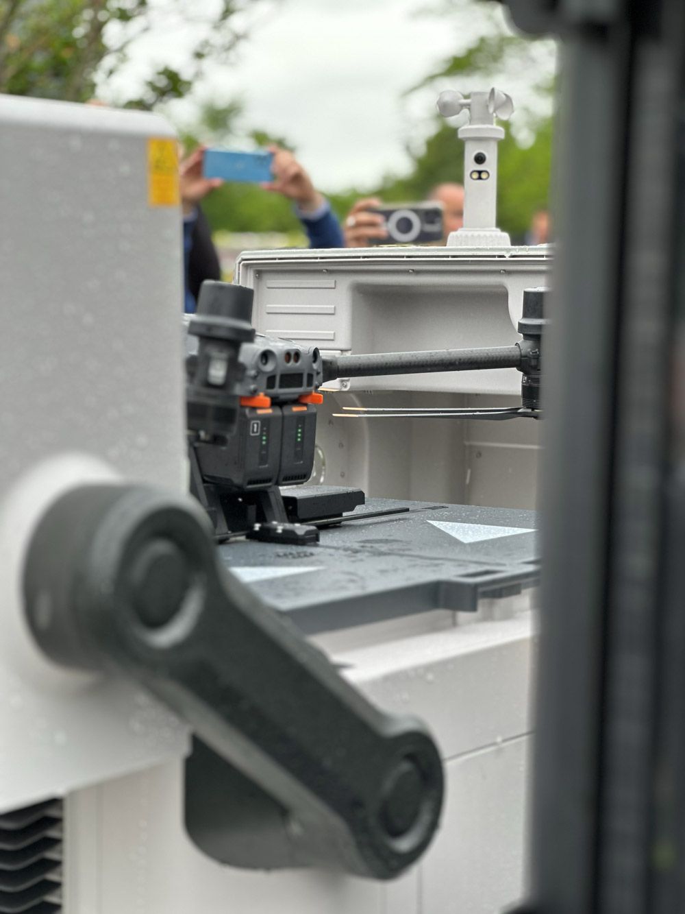 Effettivamente DJI Dock è una ''base'' dove il drone DJI Matrice 30 parte e ritorna e può ricaricarsi oltre che essere trasportato ovunque senza pericolo e può anche trasmettere velocemente tutto quello che ha catturato. È effettivamente un hangar del peso di 100 chilogrammi la cui parte superiore si apre magicamente a distanza e a comando del pilota al momento dell'occorrenza. Oltretutto la base robotica automatizzata può operare di giorno e di notte anche con difficili condizioni meteorologiche e con temperature da -35 a +50°C. Sì, perché possiede anche un rilevatore delle condizioni meteo (pioggia, temperatura, umidità, direzione del vento e intensità del vento) e una piccola telecamera che può riprendere ciò che avviene in esterno.