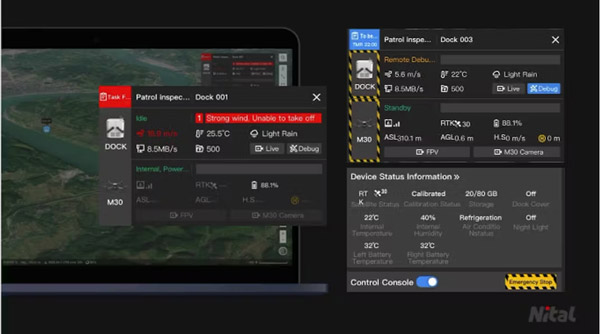 La novità però sta nel fatto che DJI Dock e DJI Matrice 30 funzionano soprattutto da remoto ossia basta collegarli ad una rete e possono comunicare con un computer a comando del pilota grazie alla piattaforma software DJI Flighthub 2. Qui il pilota, che lo ricordiamo ha sempre e comunque il controllo di tutto e deve averlo, può essere localizzato anche dall'altra parte del mondo rispetto alla posizione reale del drone della DJI Dock. E qui si possono controllare gli spostamenti automatici del drone ma si può anche intervenire immediatamente sull'andamento del volo del drone e ancora è possibile pianificare un volo, eseguire una missione, gestire un programma di spostamenti, avere tutto sotto controllo anche a livello telecamere e riprese.