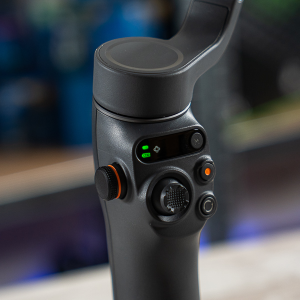Il tasto M è stato spostato dal lato alla zona superiore rispetto agli altri comandi, trovandosi anch'esso ora a portata di pollice. È integrato in una fascia che vede la presenza di un piccolo display che mostra lo stato di accensione, la carica della batteria e la modalità d'uso corrente tra Inseguimento, Blocco dell'inclinazione, FPV e SpinShot.