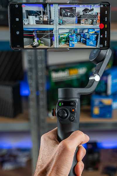 Quando si agisce sul pulsante di commutazione per passare alla modalità selfie, DJI Osmo Mobile 6 passa automaticamente alla funzione di Face Tracking: si tratta di una funzionalità molto comoda che permette di effettuare riprese alternando le due visualizzazioni con la sicurezza di trovarsi al centro dell'inquadratura quando si passa alla fotocamera frontale e senza dover perdere tempo a 'ricentrarsi'.