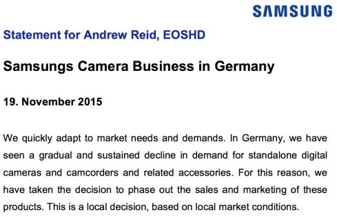 Nella nota si specifica come la decisione al momento sia locale e interessi solo il mercato tedesco. Si tratta di una risposta di rapido adattamento alle condizioni del mercato, che aveva fatto registrare per Samsung un graduale, ma sostenuto, declino nella domanda di foto/videocamere. Staremo a vedere se e quando avverrà la stessa cosa in altri paesi e se alla fine si tratterà di una ritirata globale di Samsung dal mercato fotografico.