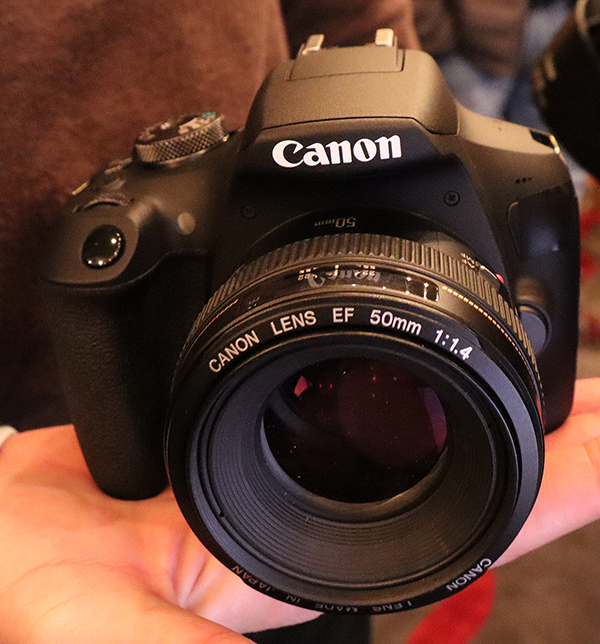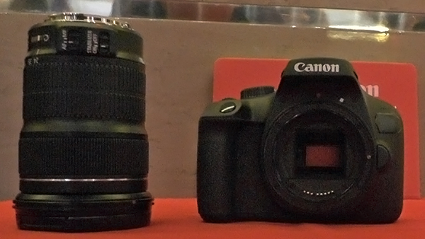 Canon EOS 4000D con il suo bocchettone in plastica e il logo ancora coperto [foto ripresa sotto embargo]